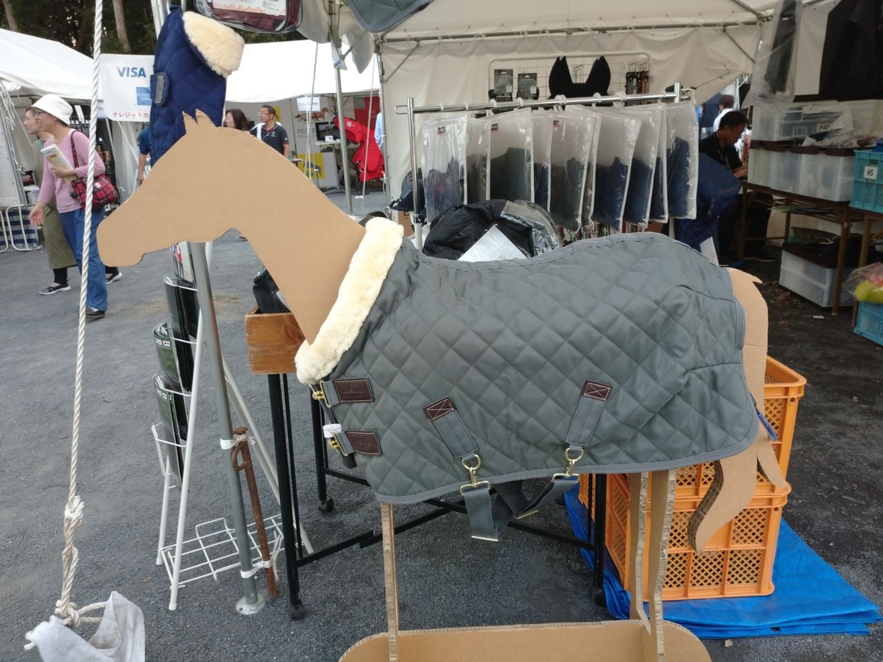 馬に乗るまでには時間があるので(そして馬装やお手入れで汚れるので)、練習で使っているソフトシェル素材のフード付きジャケットを羽織っていった。ヘルメットとロングブーツと白グローブと拍車とジャケットは、会場で身につけるために持参する。